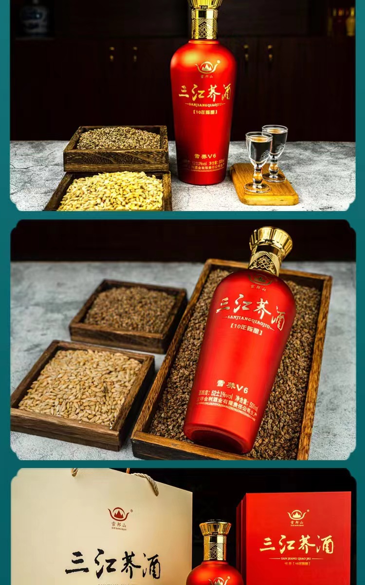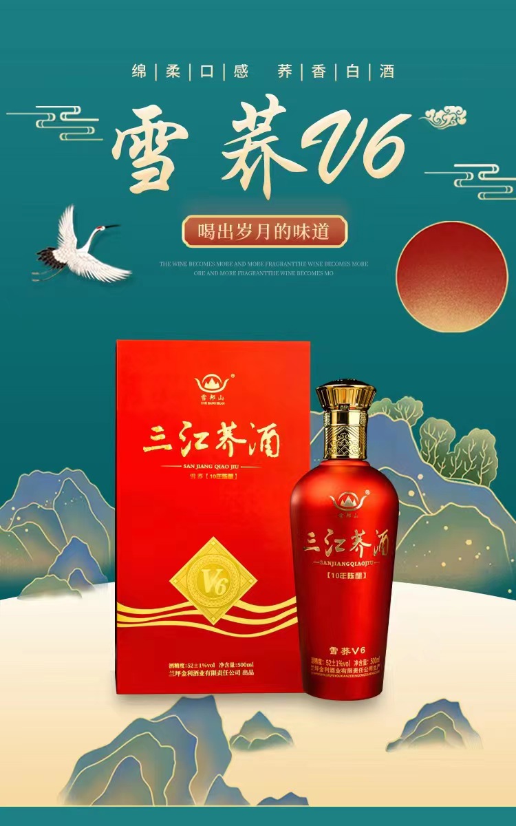 “三江荞酒”v6以高原五谷之王“苦荞”和雪邦山“白药泉水”为主料的10年原浆陈酿酒。